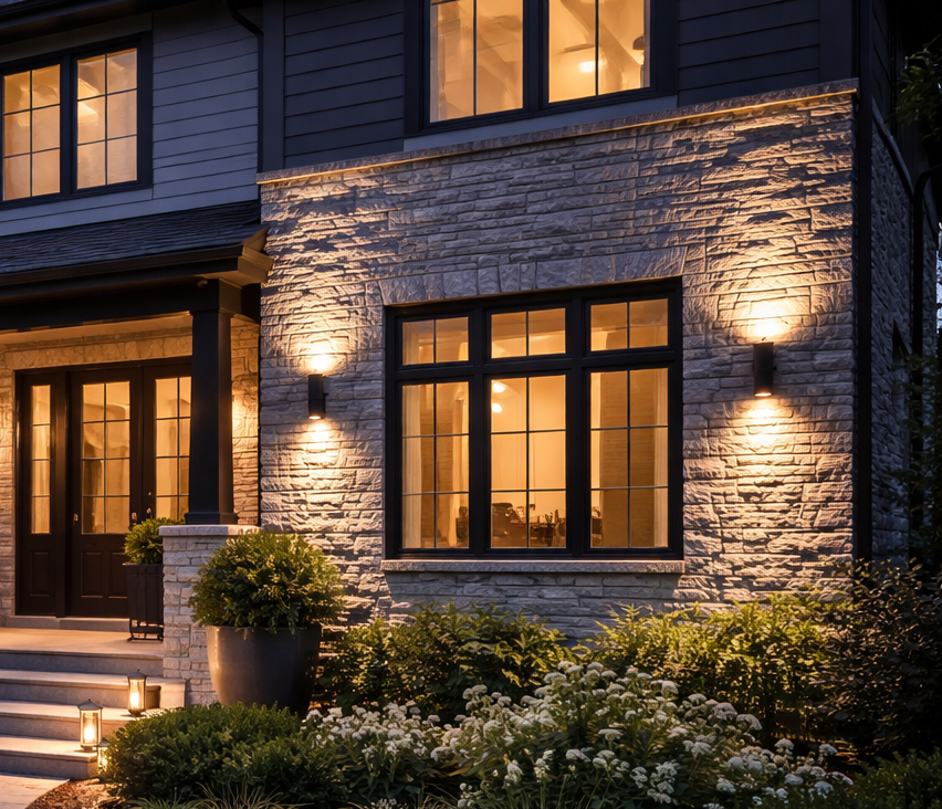 Exterior lighting that highlights architectural features, textures, and finishes, enhancing the building’s presence at night.