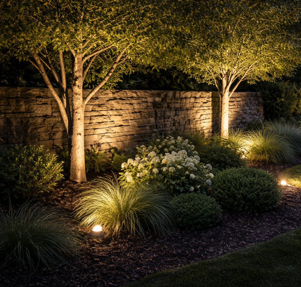 Discreet uplighting solutions designed to accent trees, walls, and features, adding structure and visual interest without visible fixtures.