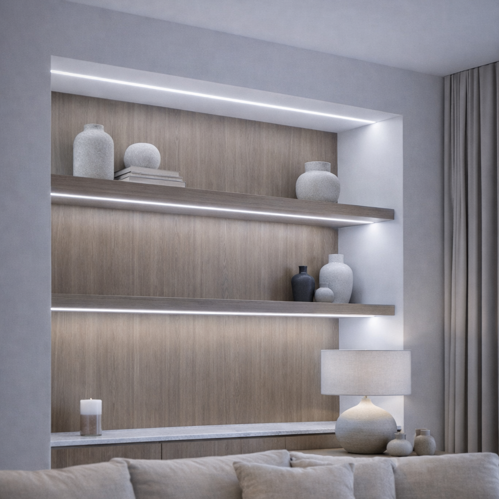Integrated lighting solutions for joinery, shelving, and concealed applications, delivering continuous, shadow-free illumination that enhances architectural detailing and adds a premium, custom feel.